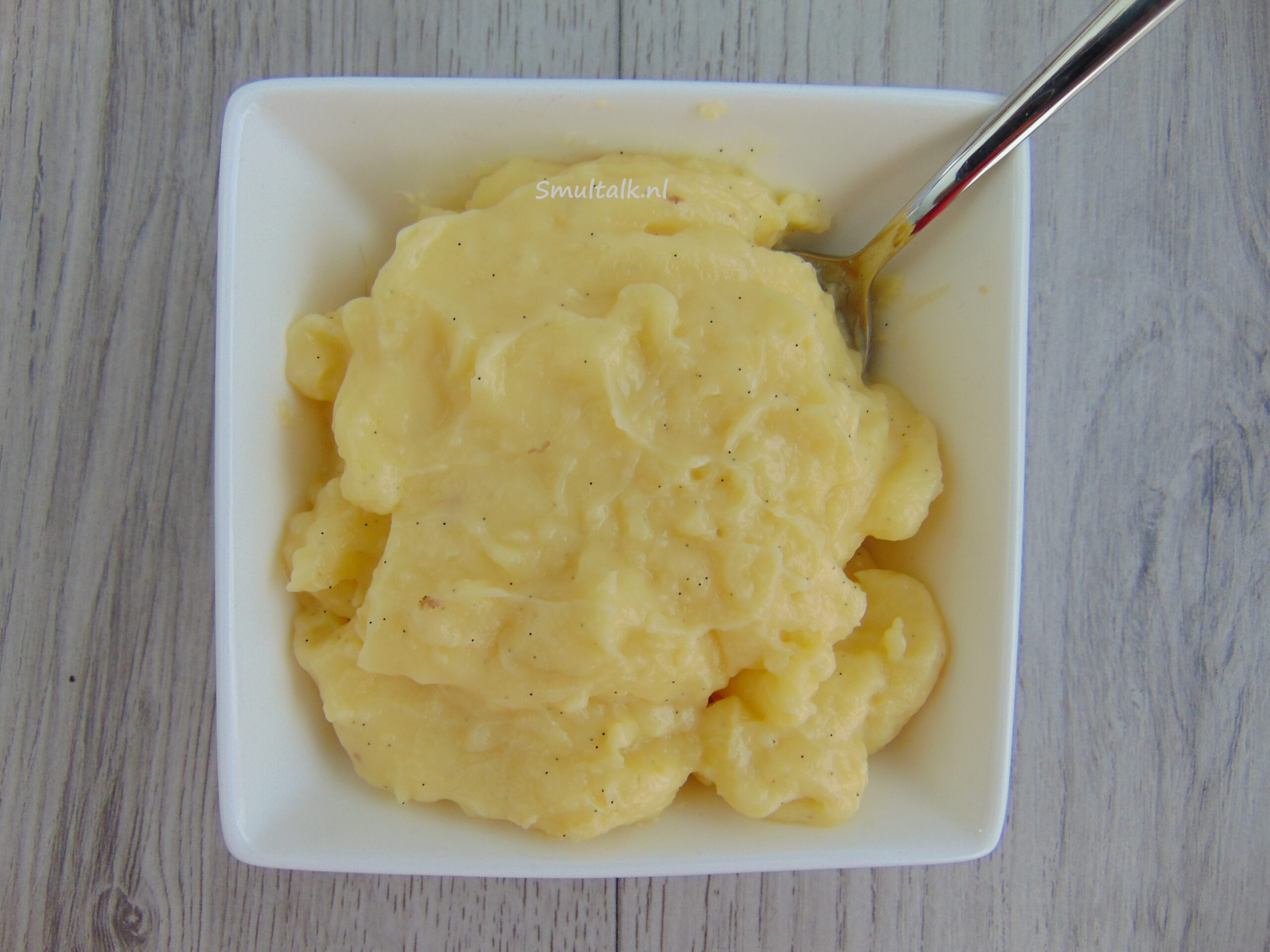 Dit is een heerlijke banketbakkersroom, ook wel gele room of crème patissière genoemd. Je kunt hiermee soesjes vullen, als vulling in een taart, op een aardbeienslof, in een puddingbroodje, als basis voor een botercrème. Je ziet het, je kunt er heel veel kanten mee op.