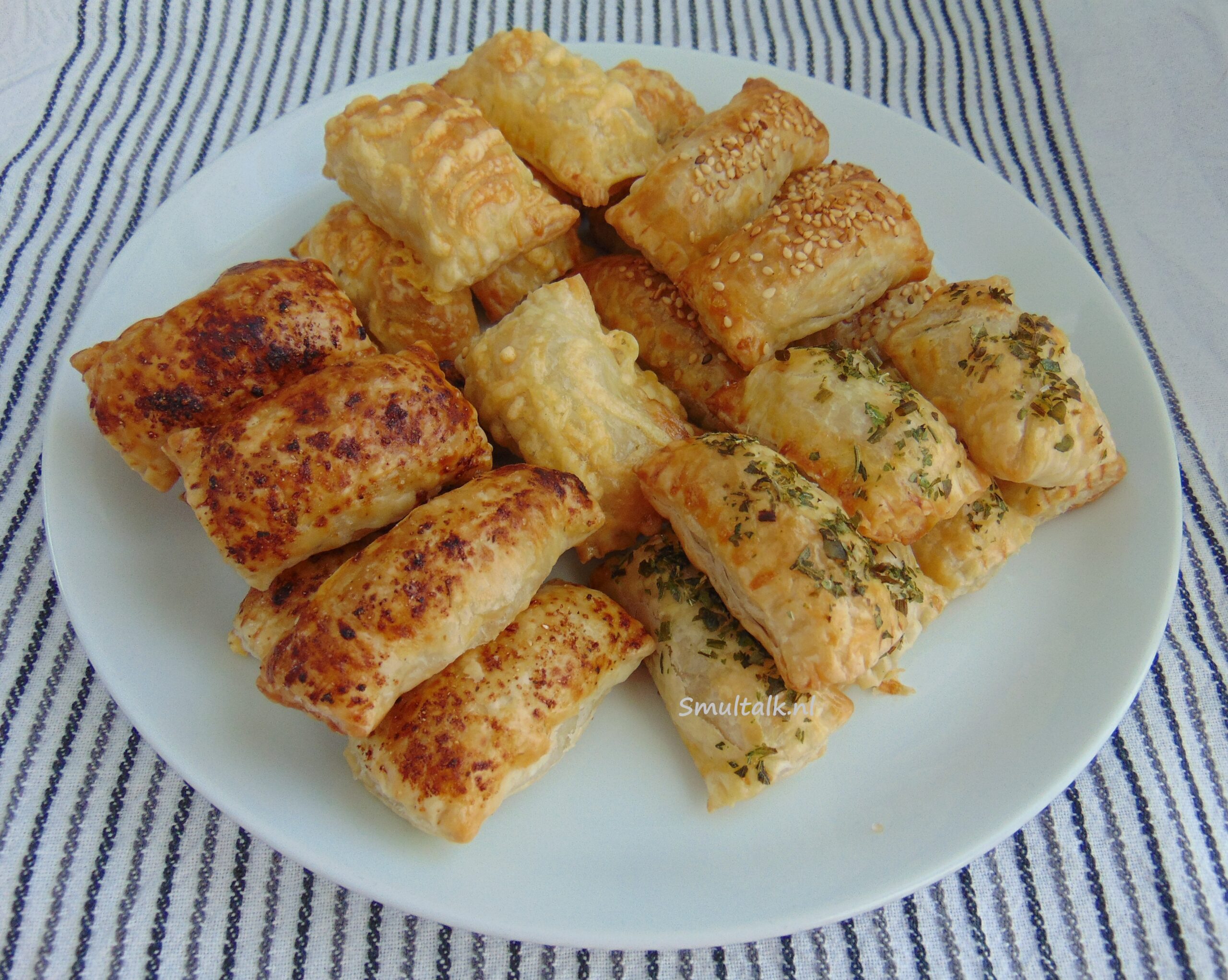 Ik heb vier verschillende varianten gemaakt. 1) met Italiaanse kruiden 2) met geraspte kaas 3) met Aromat en 4) met mosterd en sesamzaadjes. Uit één plakje bladerdeeg haal je 4 worstenbroodjes.