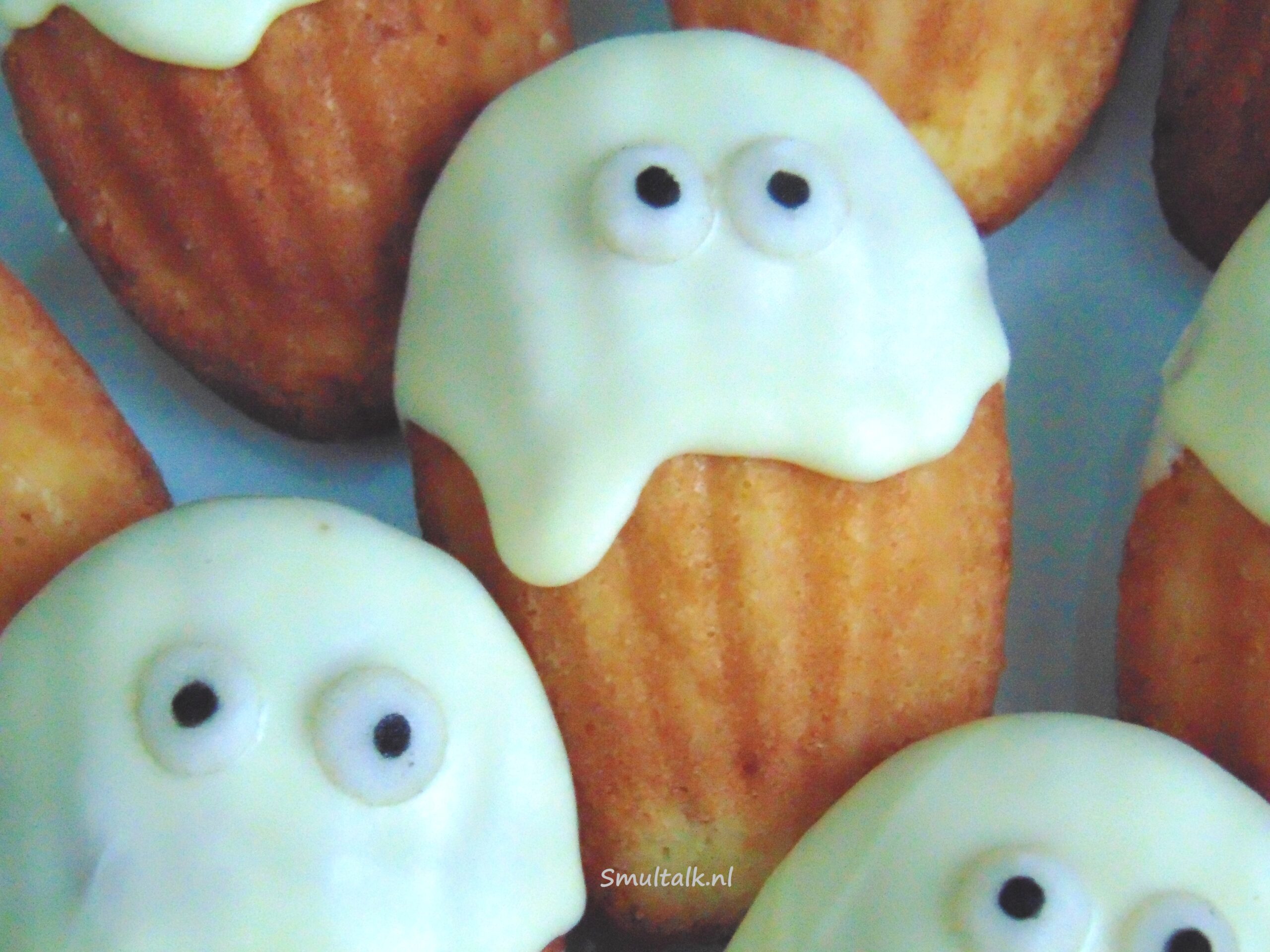 Op de valreep nog even een Halloween recept: Madeleine spookjes. Madeleines gedeeltelijk omhuld met witte chocolade en een paar suikeroogjes erop geplakt. Leuk om te trakteren met Halloween.