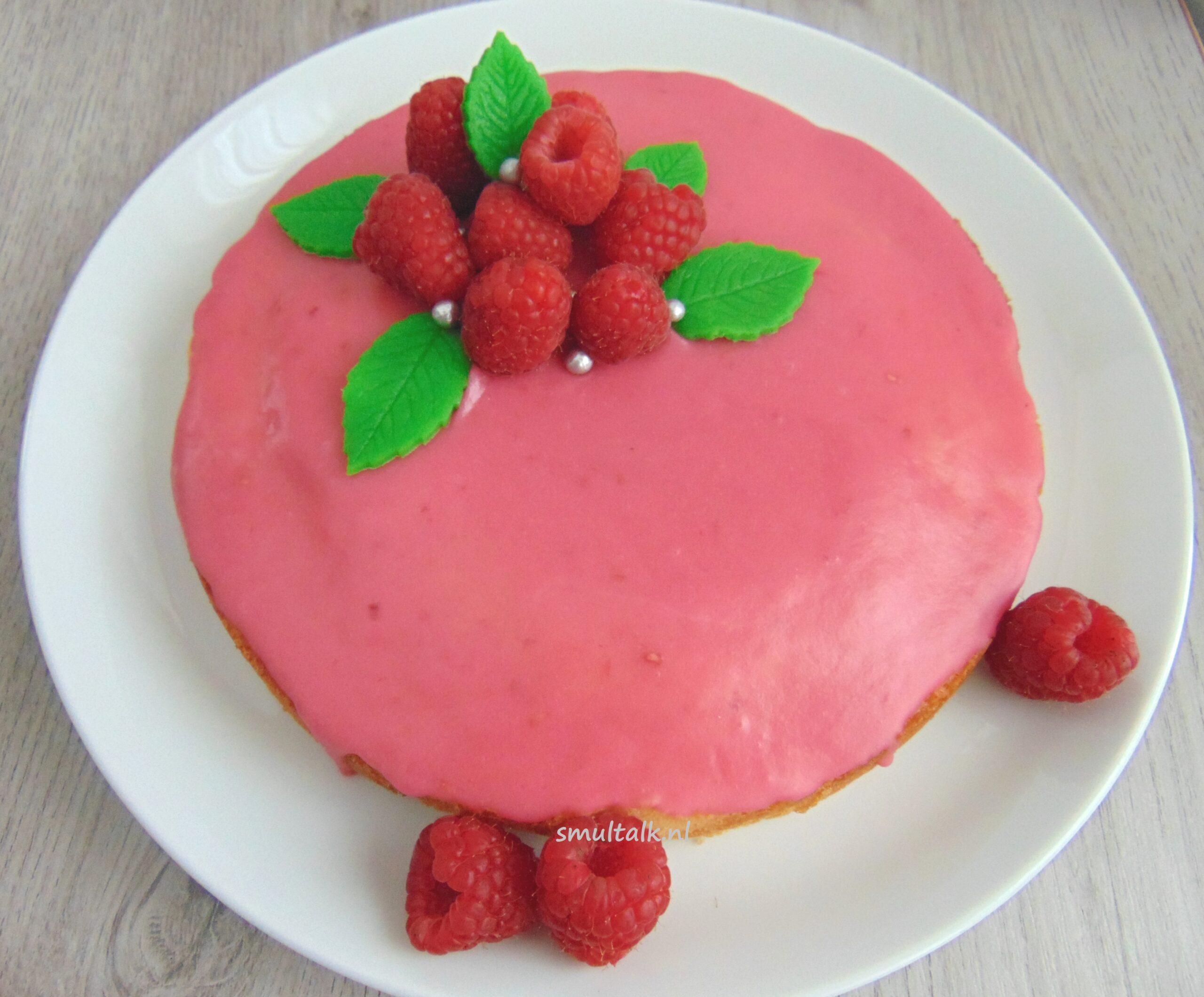 Deze taart is met frambozen gemaakt, maar je zou ook aardbeien kunnen gebruiken. De werkwijze blijft hetzelfde.