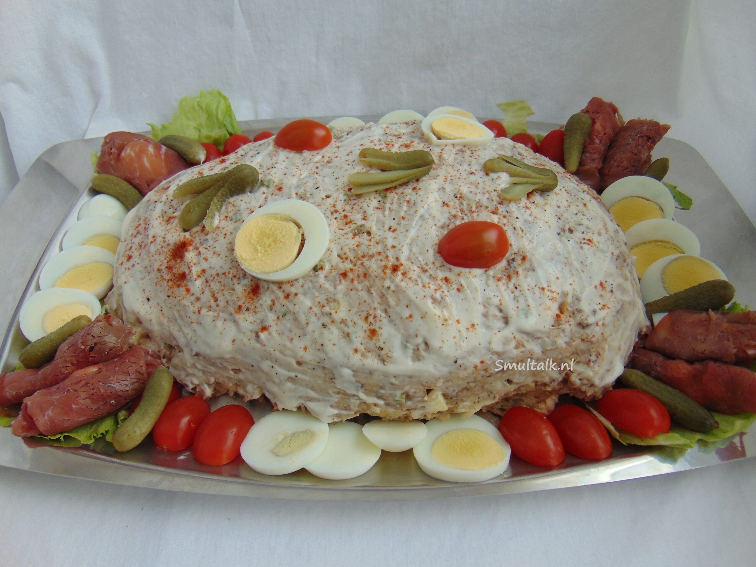 - Garneer vervolgens het geheel naar eigen smaak en inzicht, bijvoorbeeld met rolletjes vleeswaren, plakjes gekookt ei, tomaatjes, zilveruitjes, augurken.