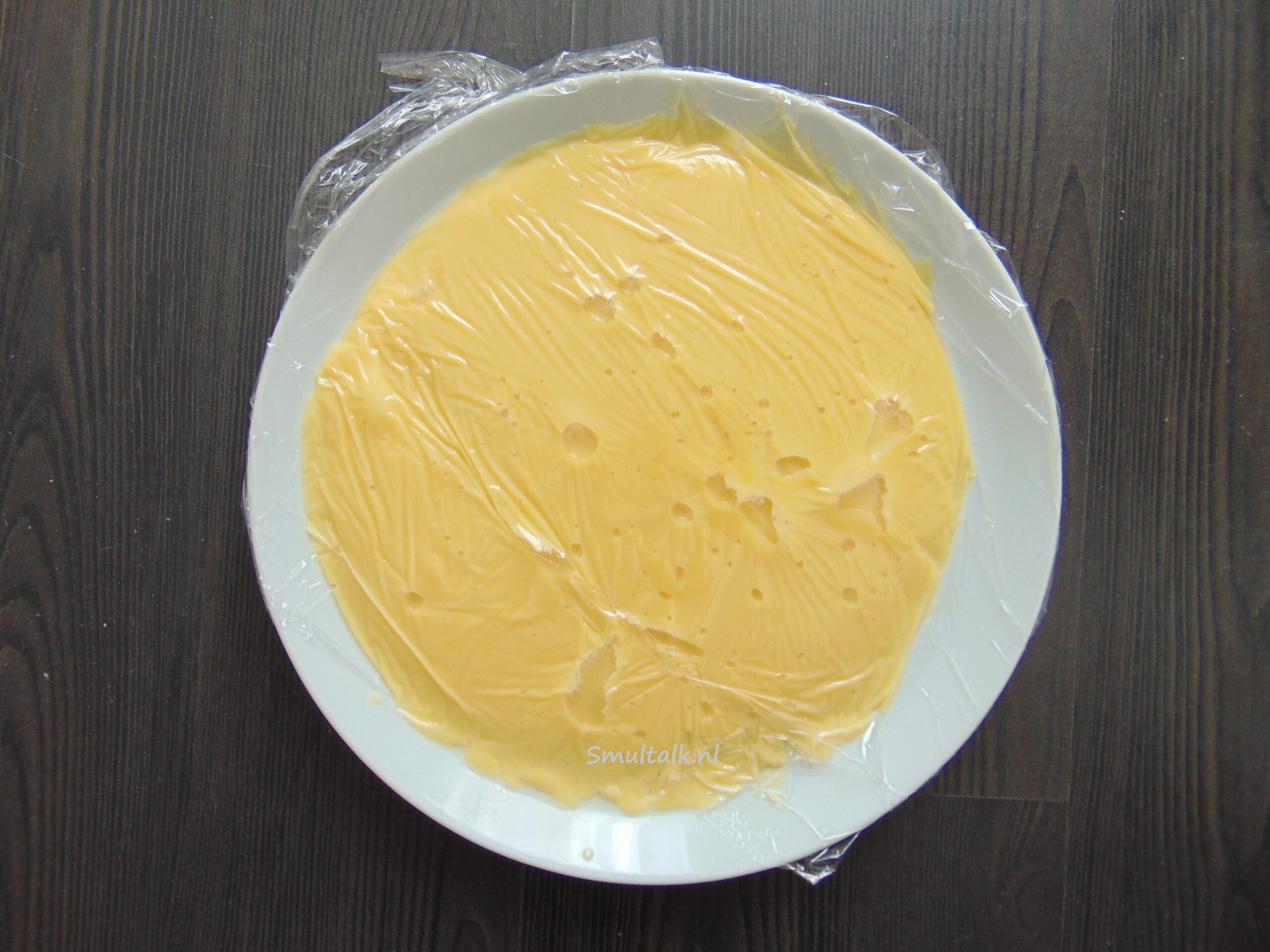 • Stort hierop de banketbakkersroom en leg er wat plastic folie op. Druk het een beetje aan (zie de foto hieronder). Dit voorkomt dat er een vel opkomt.