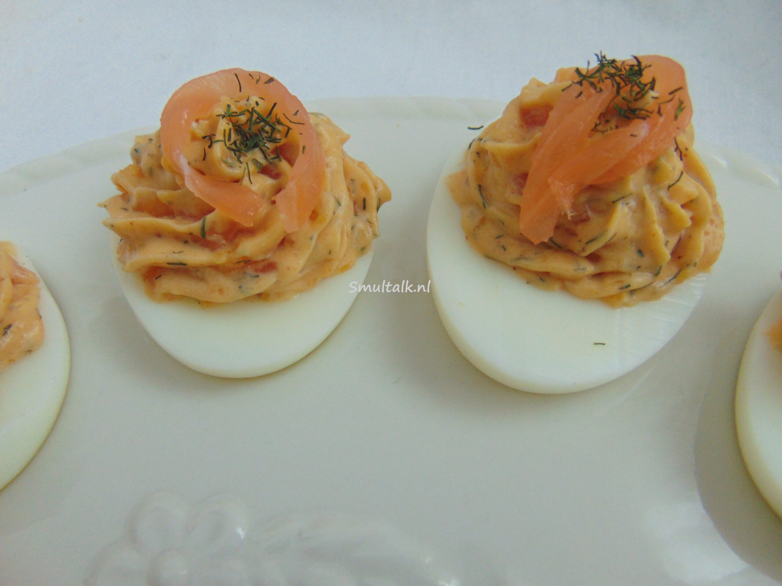 Een heerlijk eitje: gevulde eieren met gerookte zalm. Een heel lekker hapje voor bij de borrel of voor bij de paasbrunch. Het is bijna altijd een succes. Gerookte zalm en eieren gaan heel goed samen. Andere lekkere voorbeelden van gevulde eieren zijn: de klassieke gevulde eieren, gevulde eieren met heksenkaas, gevulde eieren met bacon en truffel of de gevulde eieren met kerrie.