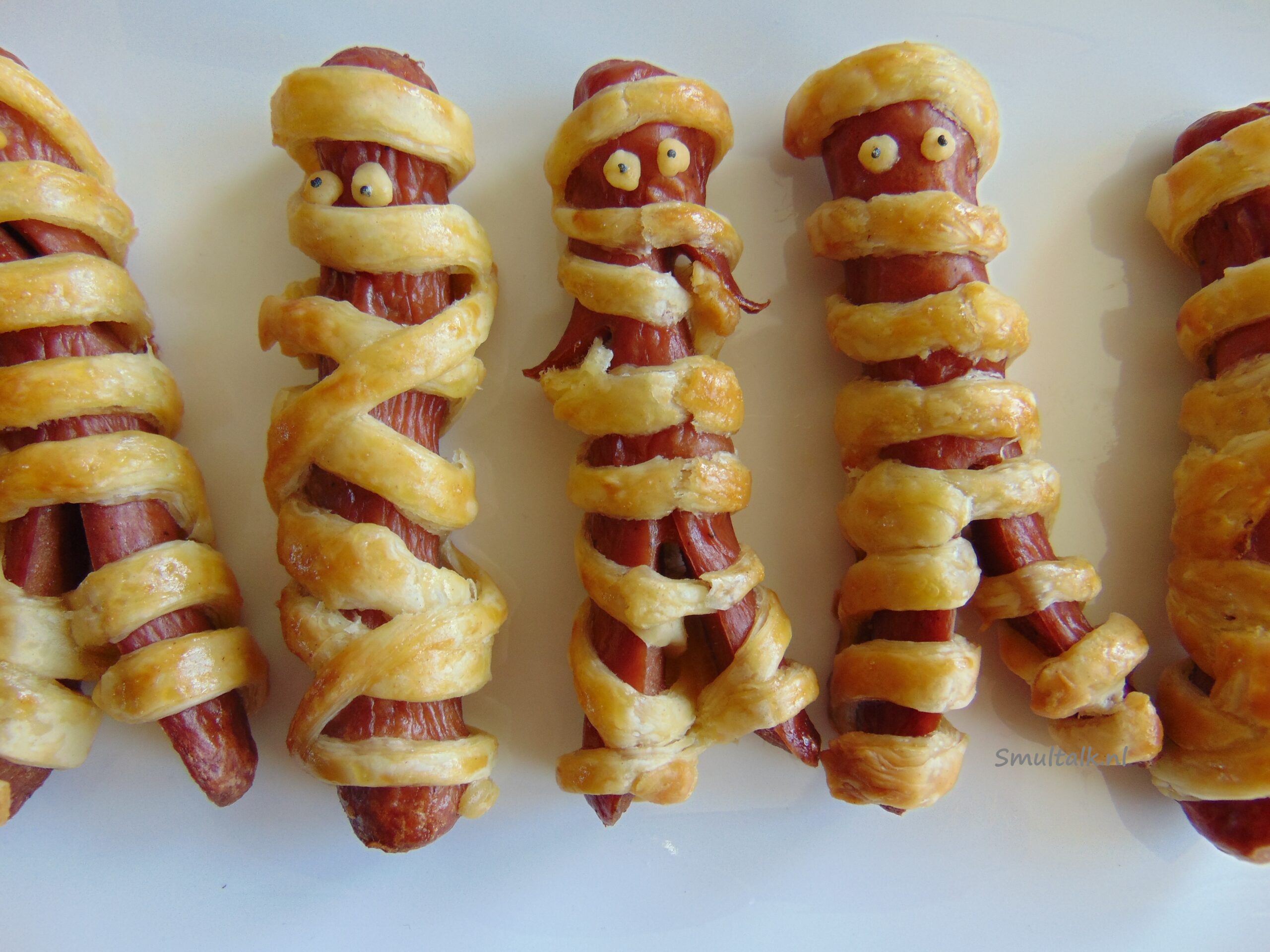 - Bak de mummies in 15-20 minuten gaar of tot het bladerdeeg een mooi kleurtje heeft. Ik heb ze iets te lang in de oven gedaan (20 minuten), waardoor de worstjes een beetje rimpelig werden. Maar de smaak was er niet minder om!