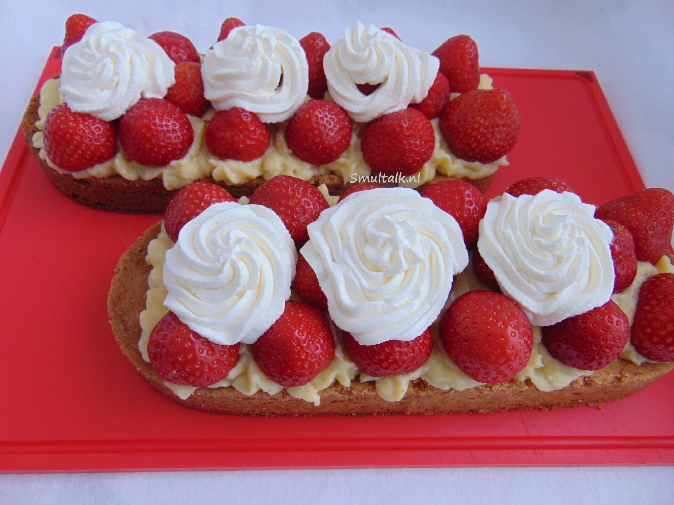 De aardbeienslof. Heerlijk gebak. In de voorgaande artikelen heb ik het over een sloffenbodem gehad en over banketbakkersroom. Dit heb je allemaal nodig, dus nu kunnen we zo’n overheerlijke aardbeienslof maken.